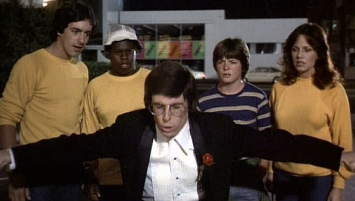 MIDNIGHT MADNESS – Five teams of college students, each seemingly representing a crude stereotype or clique, are drafted to take part in an all-night scavenger hunt. They are sent to different locations, at which point they are given a riddle to uncover the next clue that will of course lead them to the next location and so on. The yellow team are the heroes of the film, led by Adam (David Naughton) a nice but arrogant and pigheaded guy who continues to neglect his kid brother (Michael J. Fox, making his screen debut). The blue team is a wealthy but evil crew, lacking in the smarts necessary to win honestly. They are led by the obese Harold (Stephen Furst, cast against type as a villain). Then there’s the sorority, the fraternity and the nerds (led by Eddie Deezen), all of whom behave either with cruelty or stupidity.